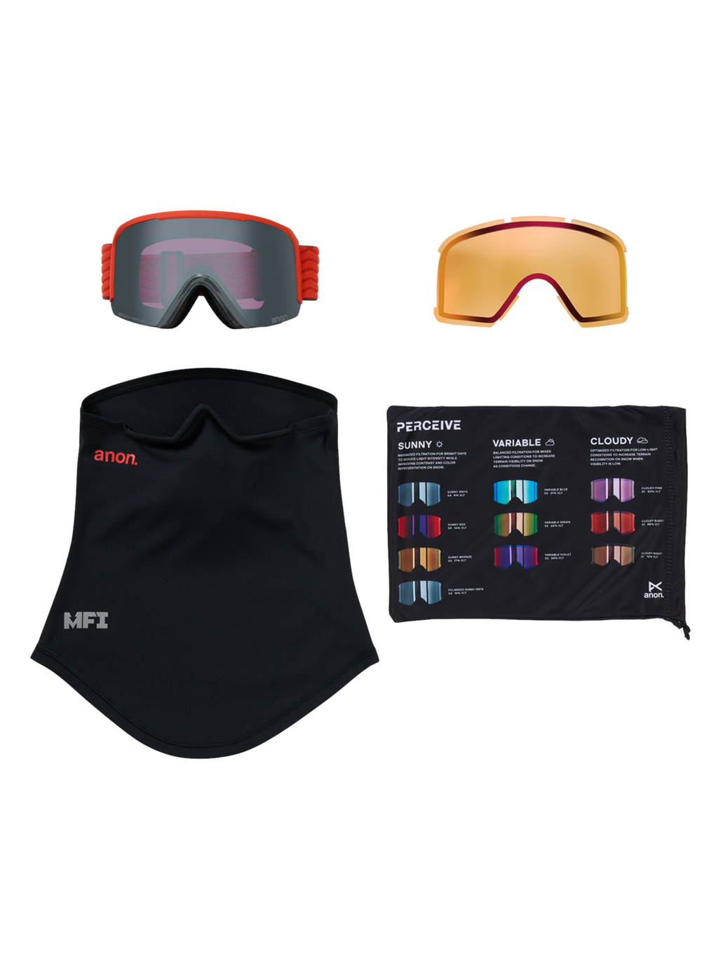 Each pair includes a bonus Perceive lens, MFI® facemask, and a microfiber goggle bag for easy storage and protection.